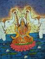 Shodashi, who has the mantra consisting of sixteen letters, has organs glowing like a rising sun. She has four hands and three eyes. She is seated on the lotus, which is placed on the body of Shiva who is lying in a peaceful posture.